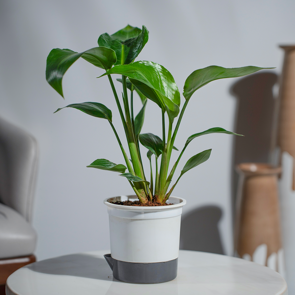 The Birds of Paradise foliage resembles small banana leaves with long petioles. The leaves on the Birds of Paradise plant are arranged strictly in two ranks to form a fan-like crown of evergreen foliage, thick, waxy, and glossy green, making it a very attractive ornamental plant.